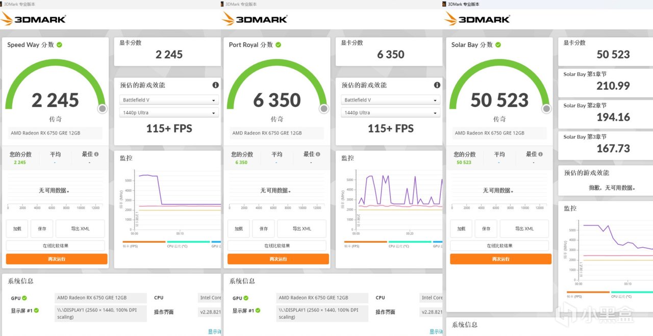 显卡支持实时光线追踪效果,在很多最推出的3A游戏大作中也支持开启光追效果,紧接着测试显卡在光线追踪性能表现,显卡在3DMark基准测试软件中的Speed Way项目得分为2245分,Port Royal项目得分为6350分,Solar Bay项目得分为50523分。
