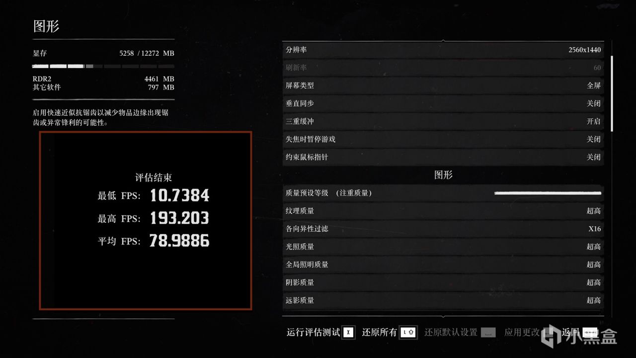 在《荒野大镖客2》游戏中选择2K分辨率,并将画质设定手动调整到最高,DX12图形API模式,其它画面项目均不修改,利用内置性能基准测试功能,实测显卡的平均帧率为78.9FPS,能够实现全程60FPS以上流畅游戏。