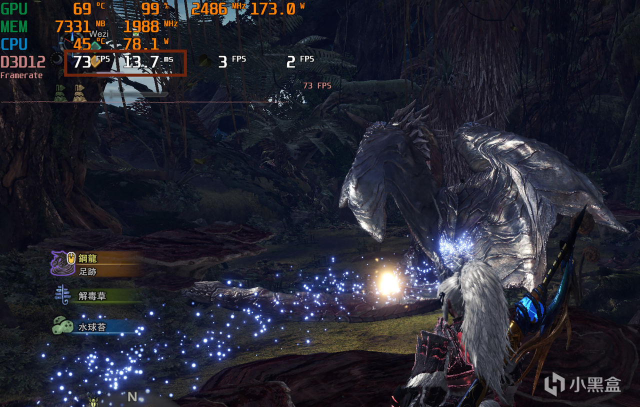 在《怪物猎人世界:冰原》游戏中选择预设最高画质,并启用4K高清材质包,由于抗锯齿会导致画面变模糊,因此手动关闭抗锯齿效果,其它画质参数均不进行修改,在野外狩猎钢龙时,实测游戏帧率为73FPS。