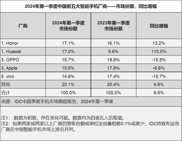 快科技4月25日消息,今天,國際數據公司IDC發佈了最新手機季度跟蹤報告,報告顯示,一季度榮耀華爲並列中國智能手機市場第一。