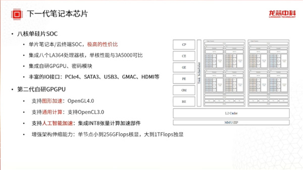 此外,第二代自研 GPU 將支持 OpenGL4.0 圖形加速,同時支持 OpenCL3.0 通用計算,集成了 INT8 張量計算加速部件,進一步支持人工智能加速,並增強了架構的伸縮能力。單節點的性能從小到 256GFlops 核顯,甚至可以達到 1TFlops 獨顯。