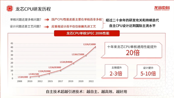 與主流CPU相比,國產CPU的性能差距主要在單核而非多核上,近十年來,龍芯CPU的單核通用性能提升了20倍,主頻提升了2-3倍,設計能力提升了5-10倍。