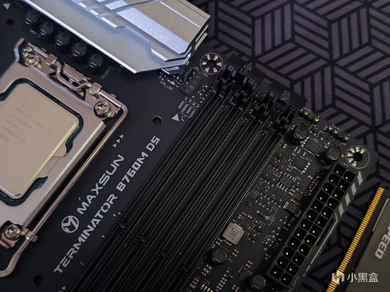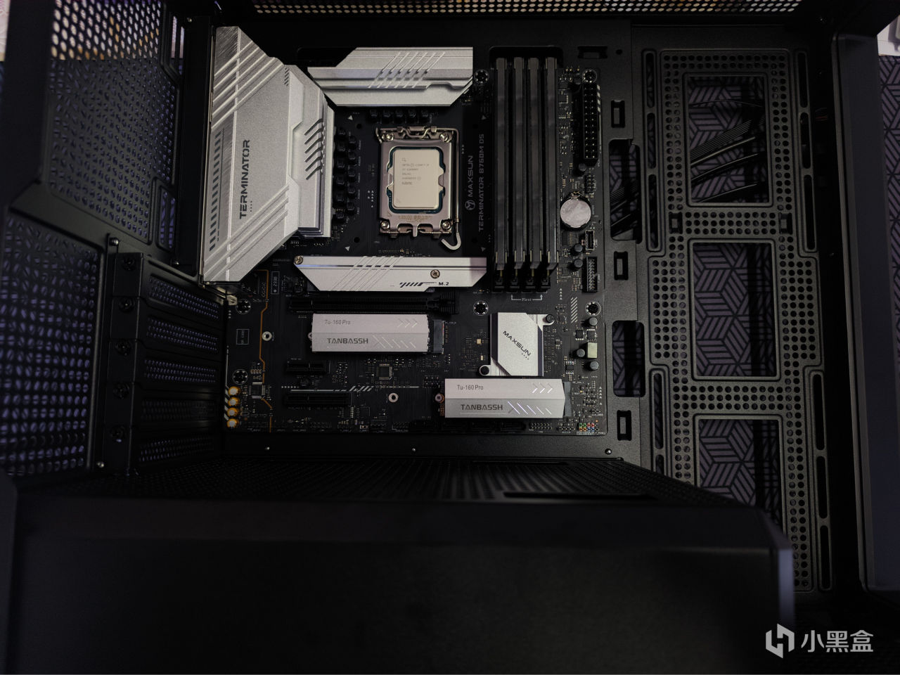全部安装好并且加装上自购的散热马甲之后,就是这个样子了,颜值这块还是非常不错的,不过在安装时要稍微小心一点,因为铭瑄这款b760m的马甲边缘有些锋利,可能会出现滴血认主的情况。