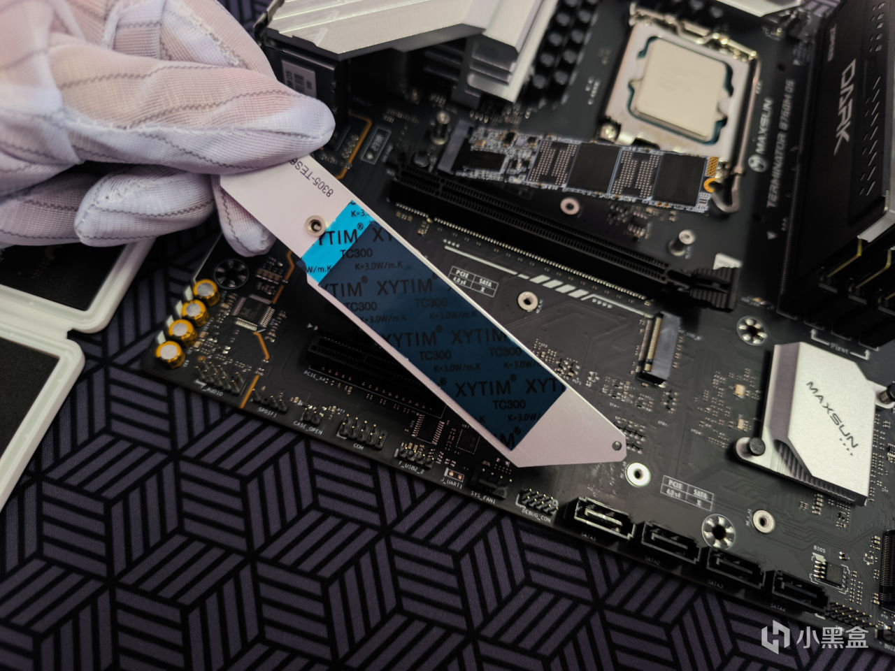 之后就是安装硬盘了,我这边是准备了三根M2的硬盘,所以SATA硬盘的部分这边不会有,铭瑄本身是自带了一个散热马甲的,所以需要先将马甲拆卸下来,并且撕掉保护薄膜,不然会出现过热现象,之后就是常规的安装教程了,不过需要注意的是,记得要看清楚各个硬盘位的速度情况以及将缺失的螺丝柱拧上,铭瑄默认是只拧了一个螺丝柱,剩下的两个需要自行拧上。