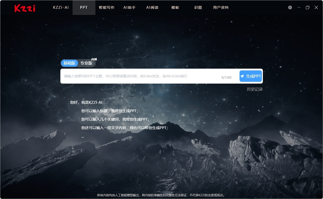 Z98AI的ppt功能是分爲基礎班和專業版,專業版本是需要你來提供大綱數據,整體出來後也是完全服務你。這裏我就就簡單的用了基礎版本。