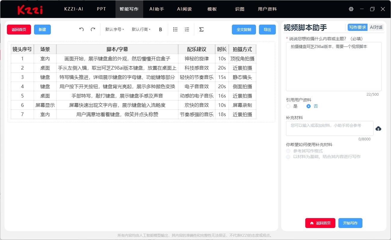 Z98AI版本的智能寫作是有點東西的,之前我用的ai鍵盤都沒有這麼全面。珂芝是直接餵了很多目前主流的東西。這裏我就不一個一個演示了。就給一個目前自媒體時代,常用的視頻腳本方案。
