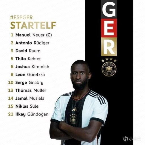 首发:1-诺伊尔、3-劳姆、2-吕迪格、5-科雷尔、6-基米希、15-聚勒、8-格雷茨卡、21-京多安、13-穆勒、14-穆西亚拉、10-格纳布里