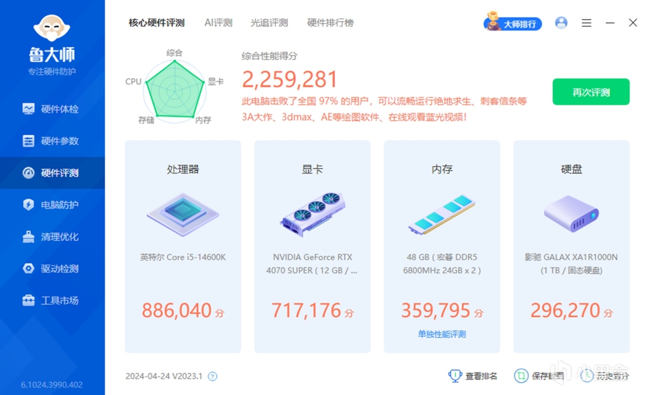 鲁大师综合得分:2259281。