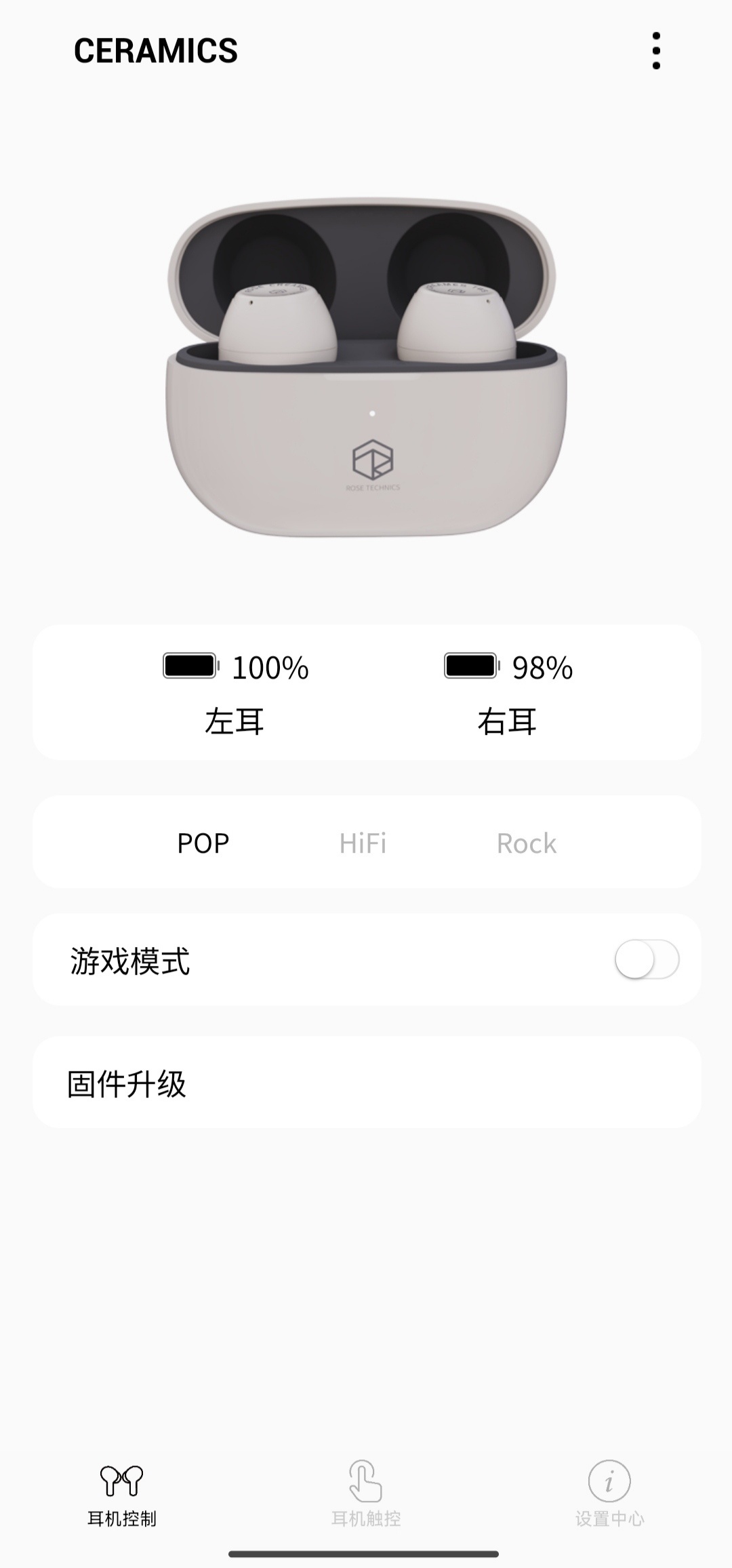 APP中不仅显示了耳机、耳机仓的剩余电量。同时可以在音乐模式,游戏模式中随意切换。音乐模式有上述POP、HiFi、Rock三种音效。支持自定义功能键以及对耳机进行固件升级。