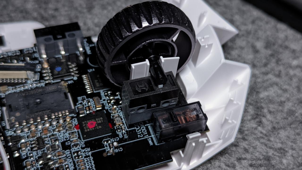 鼠標側鍵做了分離pcb版在上蓋處,不過彩屏的狙擊鍵到是在主板上,這倆手感都差不多,不軟也不硬