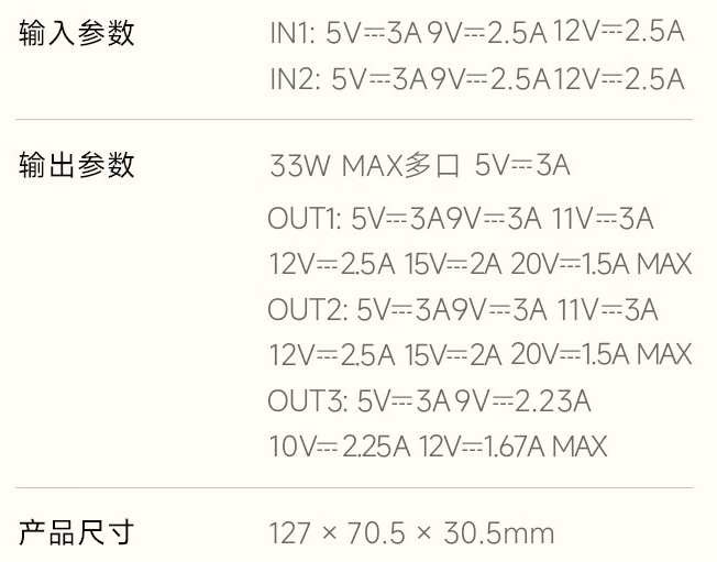 该产品搭配具有智能快充功能的小米手机充电时,功率最高可达 33W。同时支持双向快充,最高功率可达 30W,节约自充时长。