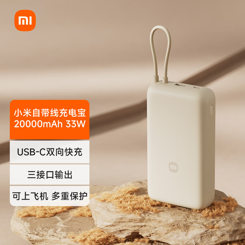 日前,小米在京东等电商平台上架一款 20000mAh 自带线充电宝(可上飞机),支持 33W 输出功率,售价 159 元。