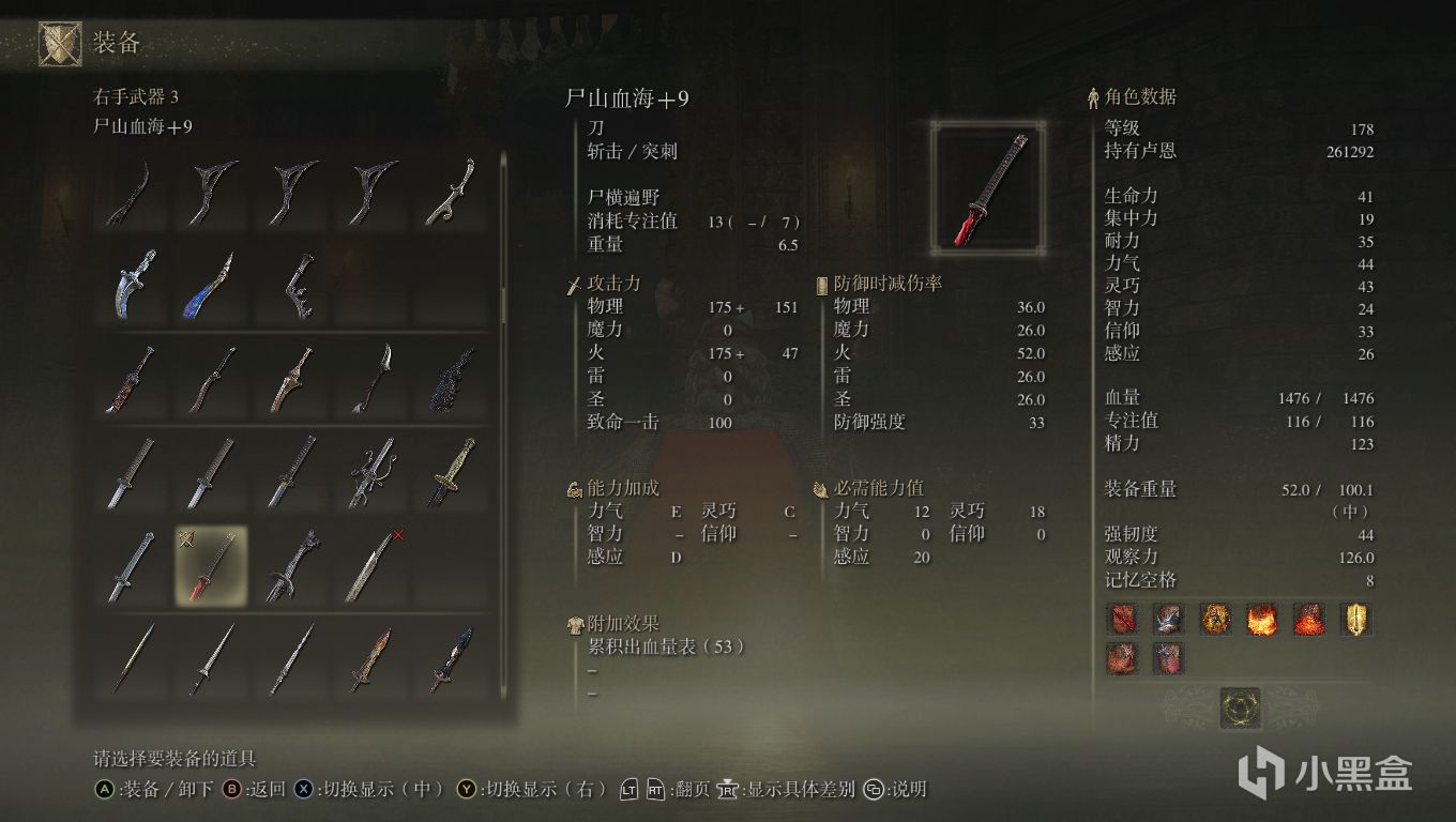 屍山血海的戰技總共分爲三段攻擊,第一段是二連快速斬擊,第二段是一個轉身動作接三連斬擊,第三段是有一定前搖的一下豎劈。屍山血海的戰技優勢在於第一段的兩下攻擊出手速度極快,戰技的攻擊會附帶劍氣能增加一定的攻擊範圍,並且戰技傷害在修復了感應補正後非常高。但是吧,戰技的後兩段出手速度並不快,並且戰技疊出血的速度和同類型的刺劍、君王叉相比較慢。在使用屍山血海的戰技時,需要注意的一點是,戰技本身並沒有削韌效果,需要靠積累出血打出硬直。因此,通常如果不是敵人絲血或打出出血狀態不會去打第3段戰技,戰技使用前後的高硬直很容易被敵人反殺(本人在首次挑戰初王時,與大哥人手一把,削了半天沒出硬直)不過傷害還是是十分可觀的。