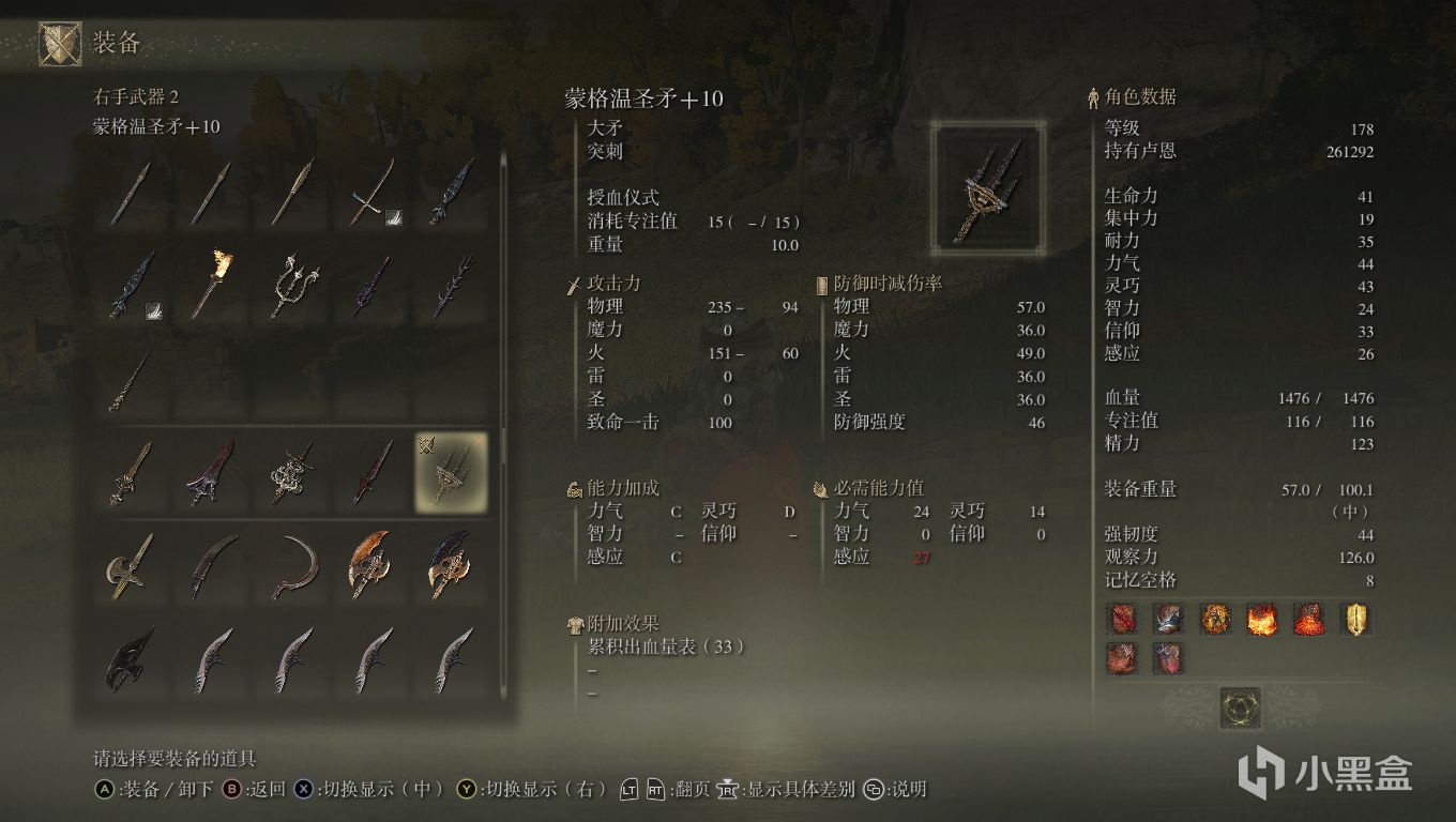 蒙格溫聖矛的武器戰技強力無比,已經不能用輪椅來形容了,用擔架形容也不爲過,甚至鎖定都不需要,直接復讀戰技,戰技能累計大量出血值(超過250),三段戰技下來周圍寸草不生。值得注意的是,敵人出血後短時間內無法再次附加,因此連續釋放的三次戰技實際上只能觸發兩次出血效果。在前期沒有神軀化劍時用它在銀行刷白金之子也是不錯的選擇。