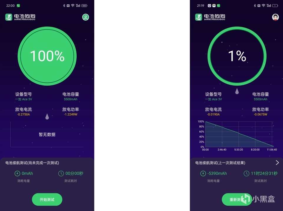 随后,我又用电池狗狗这款软件,从100%电量到1%电量进行了测试,结果是长达11小时24分31秒。