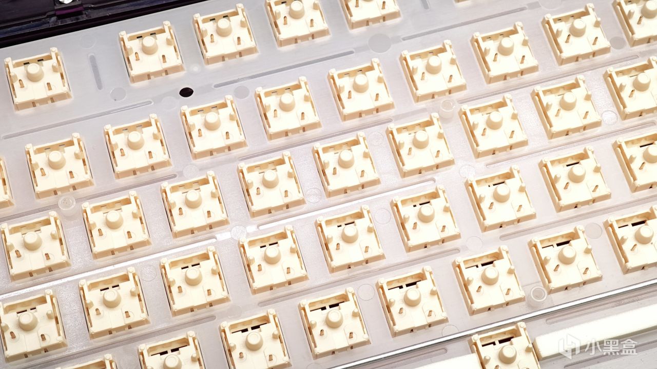 定位板方面为背面横向开槽的PC定位板,因为形变程度较小所以在插拔轴体的时候会方便一些。