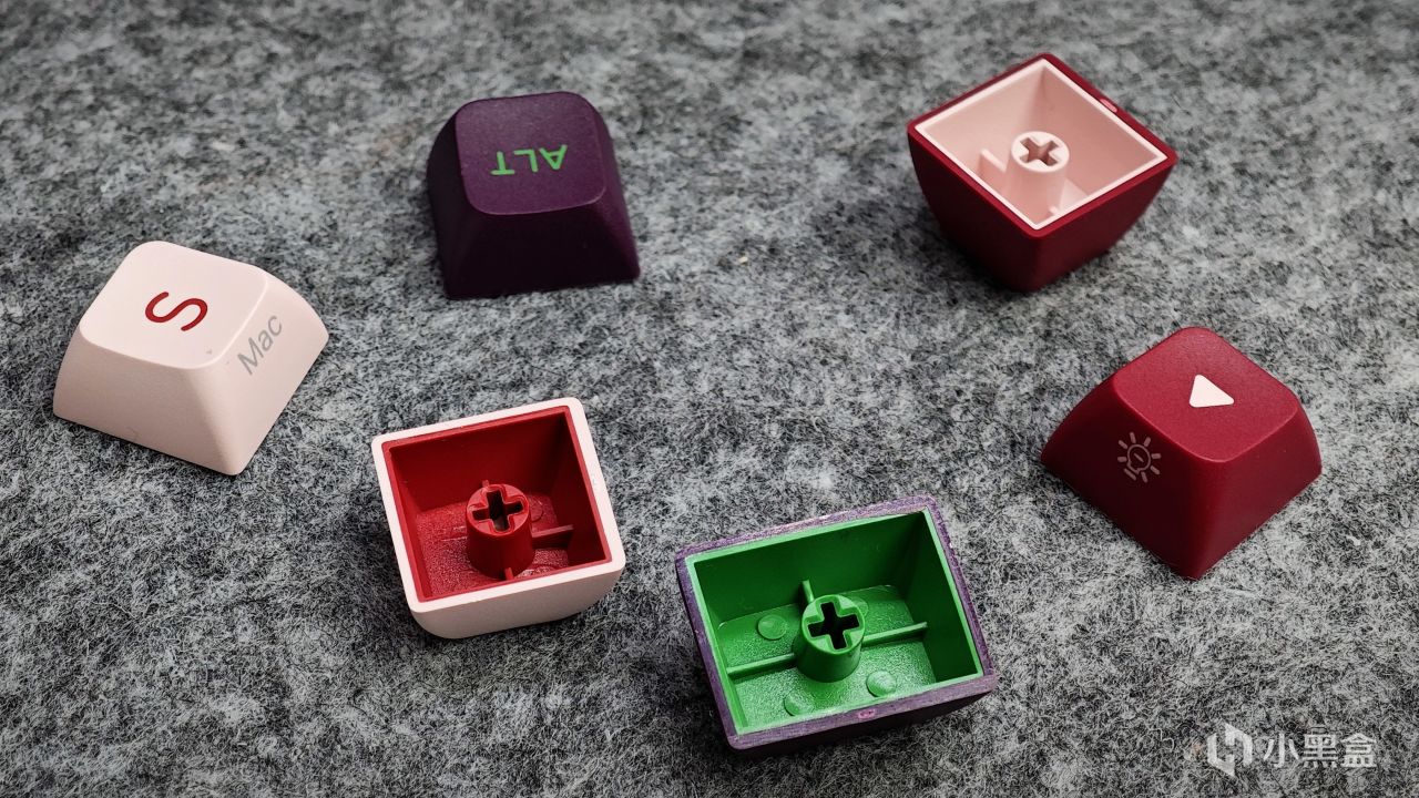 高度方面可以看到采用的是KSA高度,相较于原厂高度来说会高一些,整体呈现为球帽,对手指的贴合度会更好一些。字符采用的是双色注塑工艺,相较于热升华工艺来说在花哨方面会差一些,不过基本不用担心字符磨损。