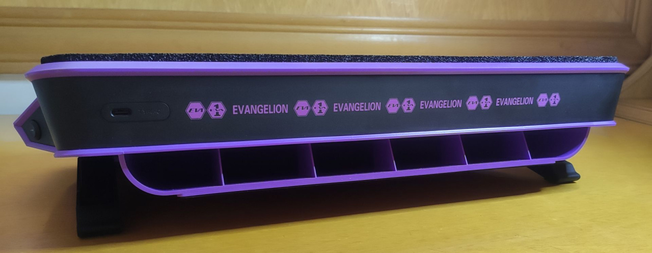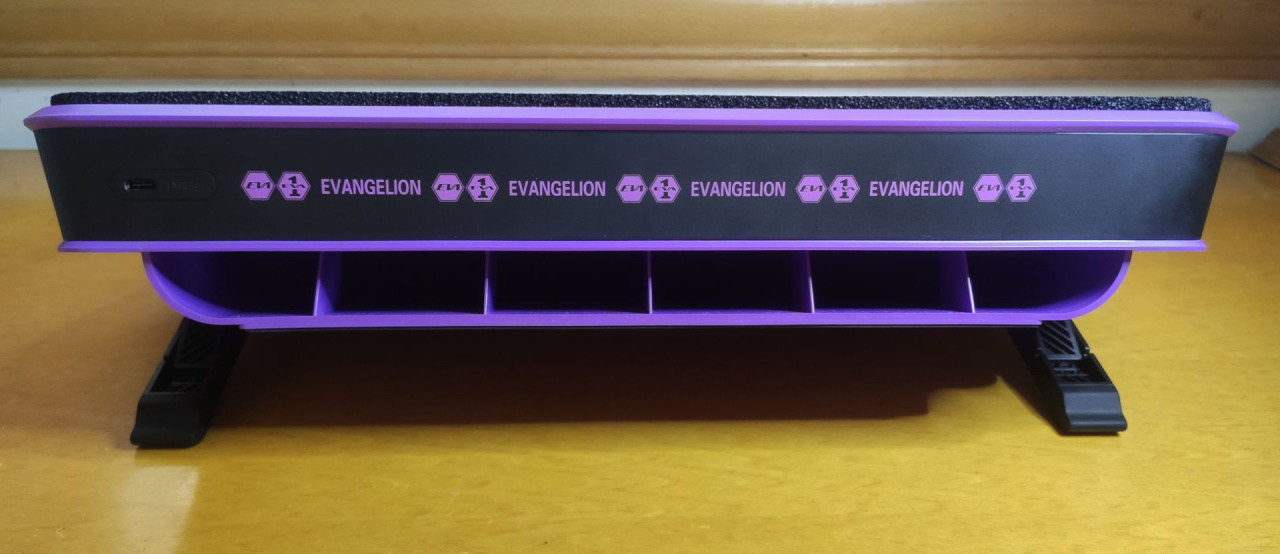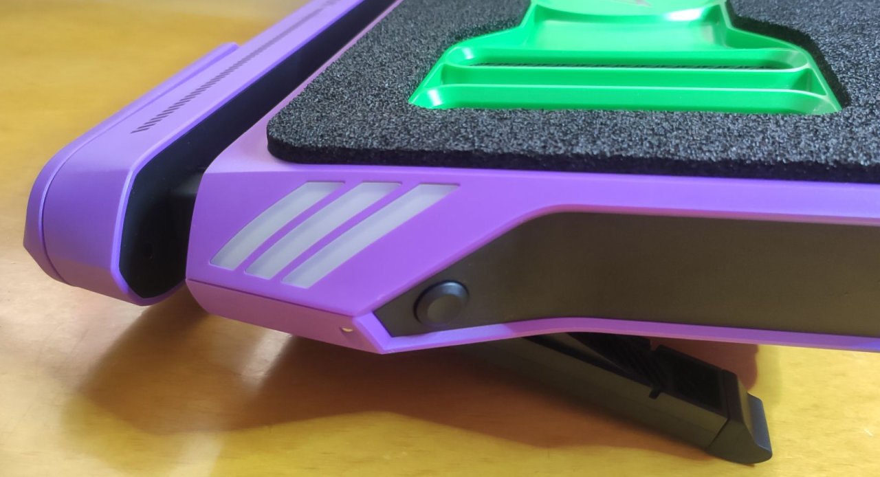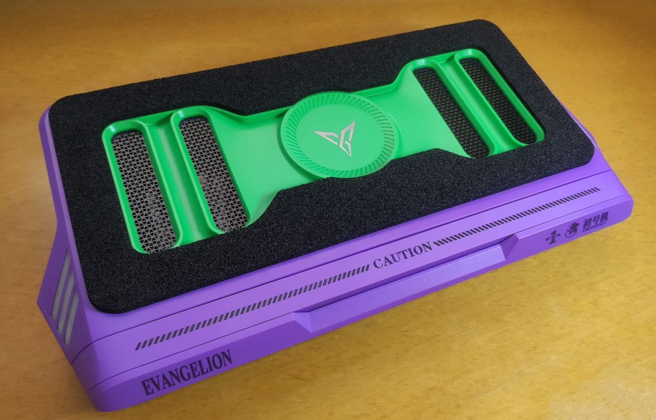 要说还得是联名款,飞智自己的统一包装说实话过于统一,再看联名款的包装真的是帅炸了!紫色为背景字体则是初号机的点缀色(绿色),还有一个特别大的EVA初号机剪影,飞智LOGO都只占很小一个位置。