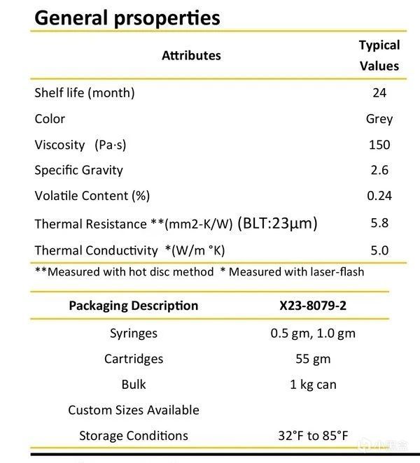 根据信越的Datasheet数据,X23-8079的参数不像对手那样吸引眼球。它的导热系数(Thermal Conductivity)仅有5.0W/m•K,远远低于PTM7950的8.5W/m•K。