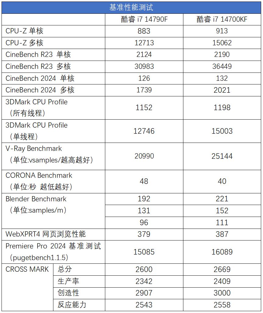 生產力基準測試考驗處理器的多線程性能,在V-Ray Benchmark中,酷睿i7 14790F相比酷睿i7 14700KF的差距爲16%,在CORONA Benchmark中酷睿i7 14700KF的渲染時間要比酷睿i7 14790F少16%,Blender 4.0 Benchmark的三個場景中,酷睿i7 14790F相比酷睿i7 14700KF的差距在14%左右。從生產力測試來看的話,和CPU多線程基準測試的性能差距是一致的。