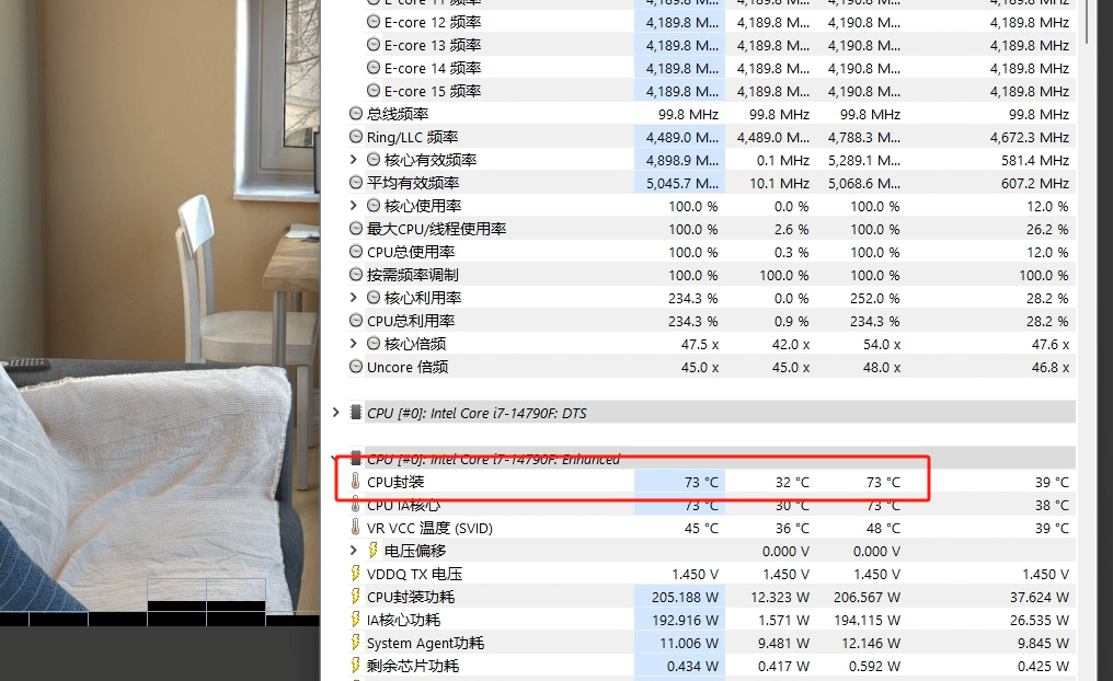 我們在BIOS中將CEP功能關掉,然後在Actual VRM Core Voltage選項中選擇offset -0.05V電壓。此時再使用R23考機,可以看到考機功耗從之前的290W左右降至了206W左右,考機溫度則大幅下降至73℃左右,此時的R23成績並未下降,可以認爲這樣的降壓調節不影響性能,但獲得了大幅的滿載溫度下降,對即將到來的夏天更加友好。