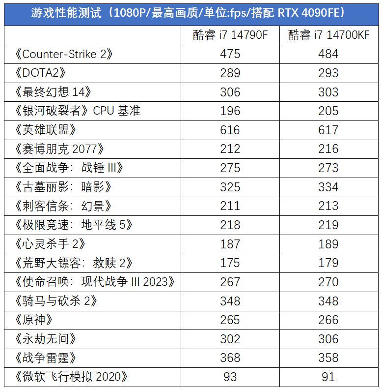 作爲中高端處理器,玩家們一定也很關心它的遊戲性能表現。這次我們一共測試了18款當下主流的遊戲,包括電競遊戲、網絡遊戲和各種3A大作。從測試表現來看,酷睿i7 14790F和酷睿i7 14700KF在遊戲中的表現是互有勝負的,在對頻率敏感的遊戲中酷睿i7 14700KF表現略好,而在對緩存敏感的遊戲中則是酷睿i7 14790F的表現更好。即使在部分遊戲中酷睿i7 14790F相比酷睿i7 14700KF幀率略低,但差距也僅爲2%左右,在遊戲中的感受沒有明顯差別。實際上,如果平均一下這些遊戲的幀速對比的百分比的話,酷睿i7 14790F和酷睿i7 14700KF的平均差距不到1%,可以說是差不多的遊戲表現了。
