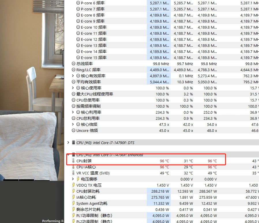 酷睿i7 14790F的默認PL1爲125W,PL2爲219W,對於臺式機平臺來說,大多數玩家都會解鎖功耗後使用,以獲得更高的性能釋放。我們在主板BIOS中解鎖功耗限制後,在室溫28℃的環境中,使用CineBench R23進行10分鐘的考機測試,可以看到酷睿i7 14790F的考機功耗爲290W左右,性能核全核頻率爲5.3GHz,能效核全核頻率爲4.2GHz,封裝溫度爲96℃左右,相對來說還是比較高的。