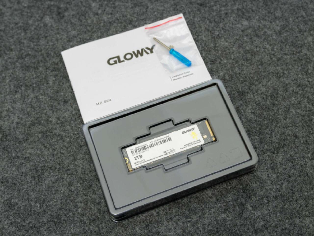 拆開包裝盒,裏面除了SSD本體以外,還有產品說明書和用來安裝的小螺絲刀、備用M.2固定螺絲。