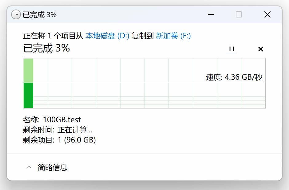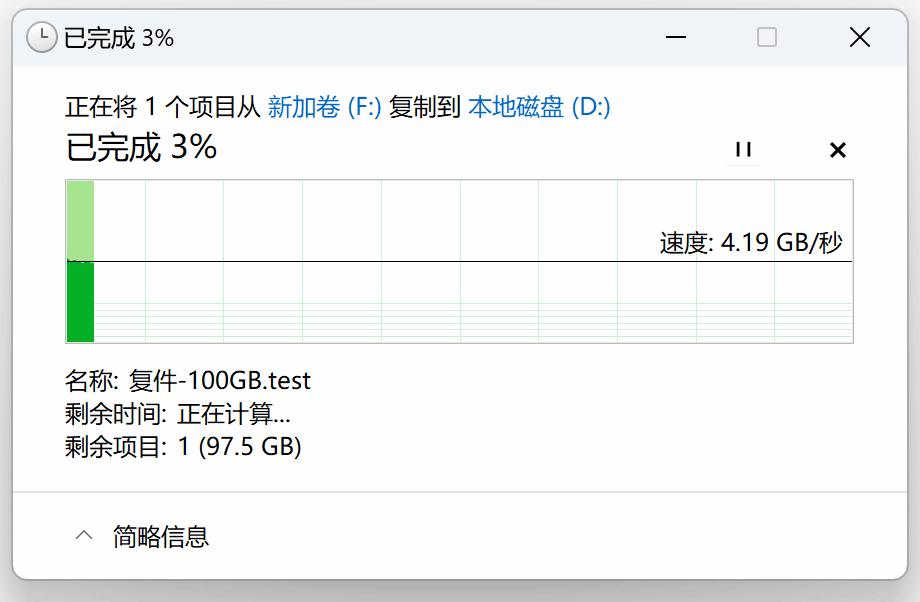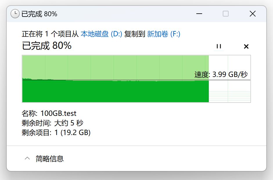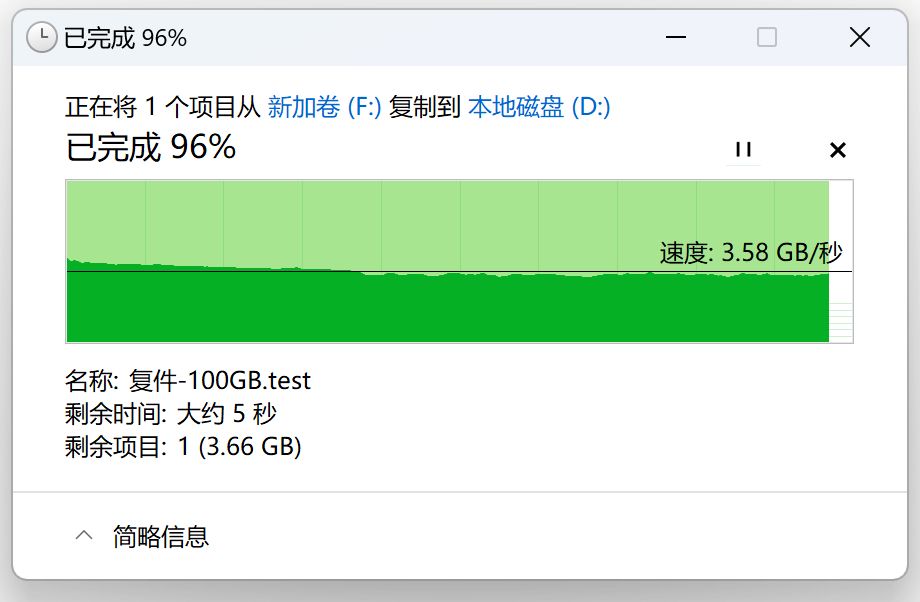 那麼光威弈二代在Win11中進行復制粘貼的表現如何呢?這裏我用IOMeter生成了一個100GB的不可壓縮僞隨機數據測試文件,從對拷盤光威弈旗艦盤 4TB中向光威弈二代 2TB進行粘貼操作,可以看到在SLC Cache容量範圍內的寫入曲線非常平直穩定,速度保持在4GB/s左右,基本已經達到了Win11文件管理器的單任務讀寫速度上限了。