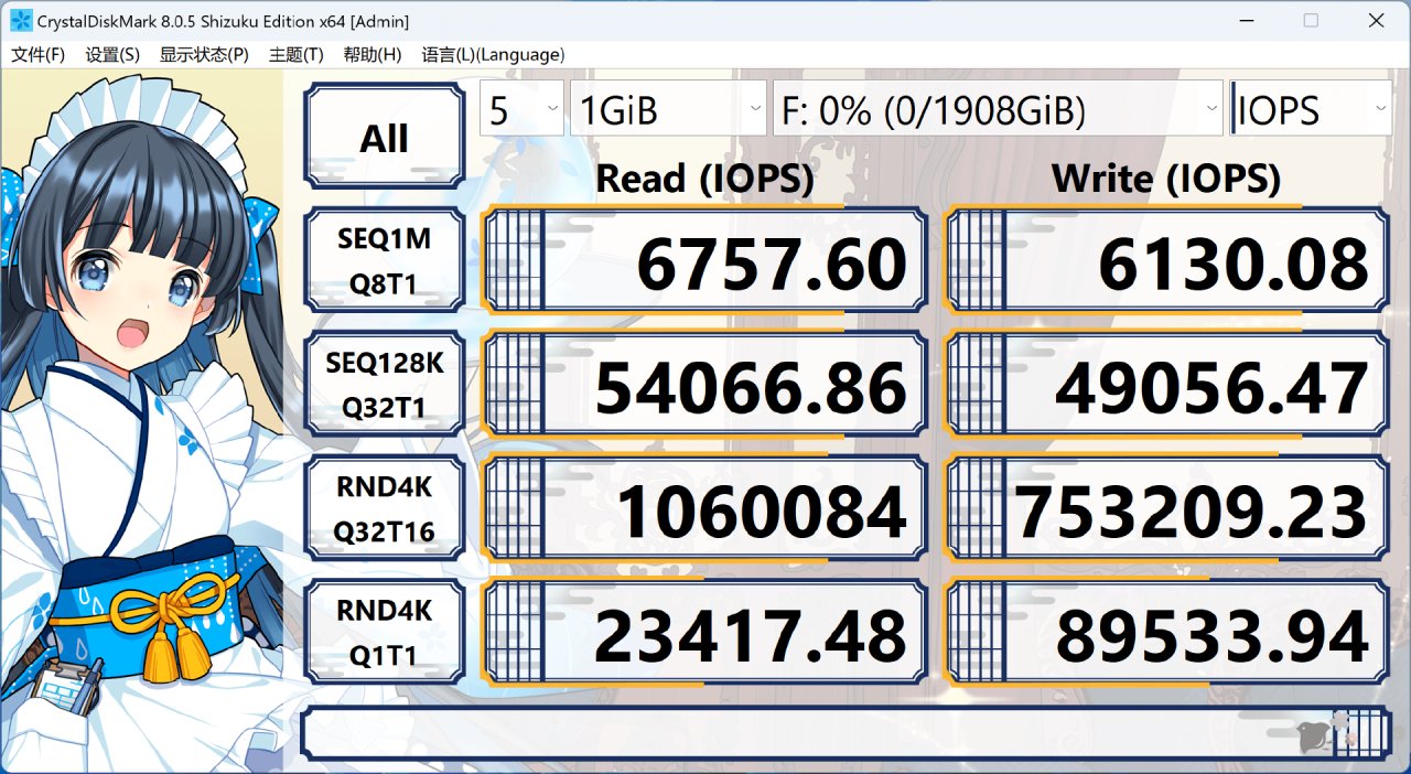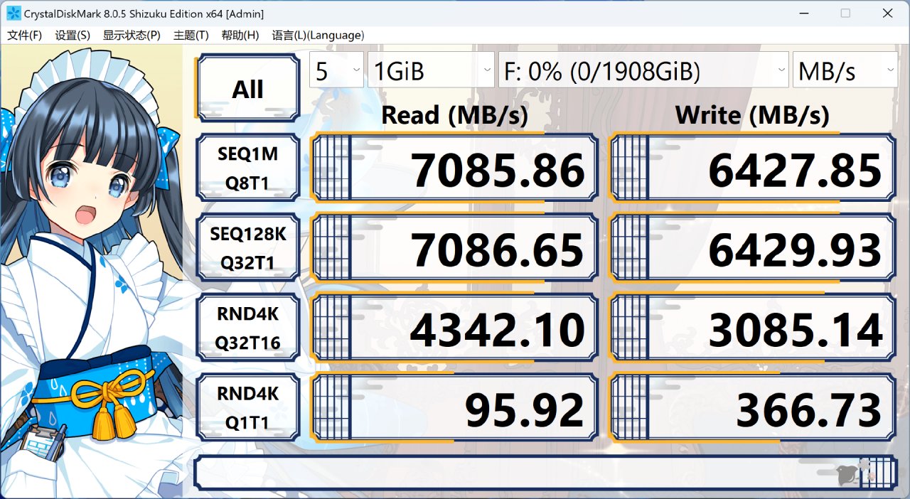 空盤狀態下,用CrystalDiskMark跑個分看看,順序讀取速度達到了7085MB/s,讀取速度達到6427MB/s,均超過的官方標稱的性能參數。