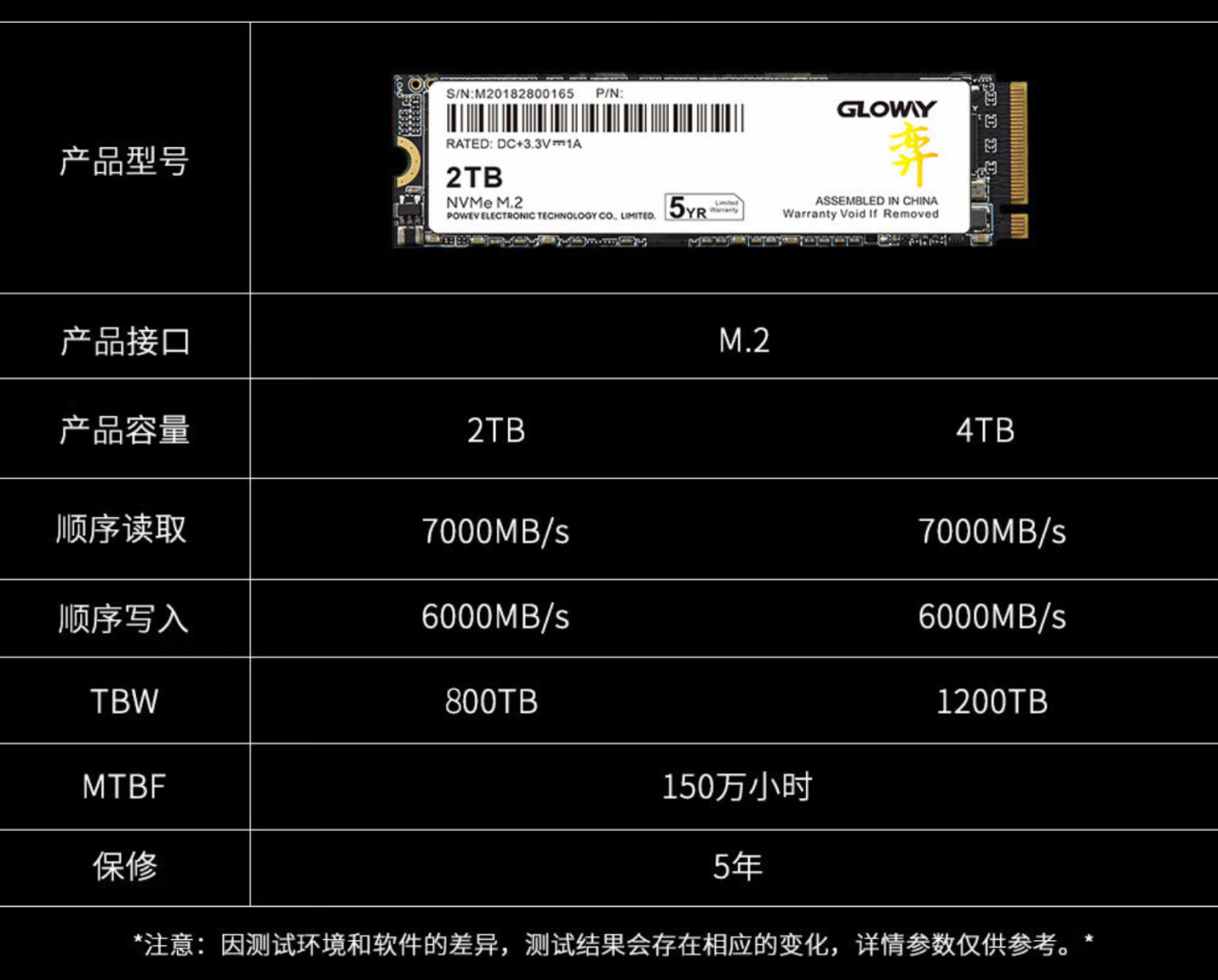 光威弈二代的起步容量就是2TB,目前最高容量可以達到4TB,比較適合有大容量數據存儲需求的場景,目前官宣標稱性能如下圖所示,最高順序讀寫速度分別能達到7000MB/s和6000MB/s。如果廠家能看到我這篇測評的話,建議下次把隨機讀寫性能也給標上,這樣更方便用戶綜合考量性能。