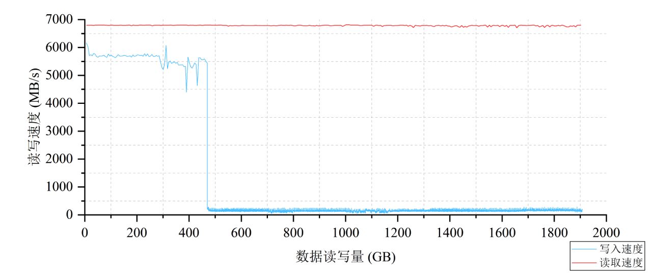爲了深入探索光威弈二代 2TB的SLC Cache方案,這裏我們對其進行RAW格式下的全盤容量下順序讀寫測試(512KB,Q32T1),並以曲線圖的形式爲大家展現全程速度。