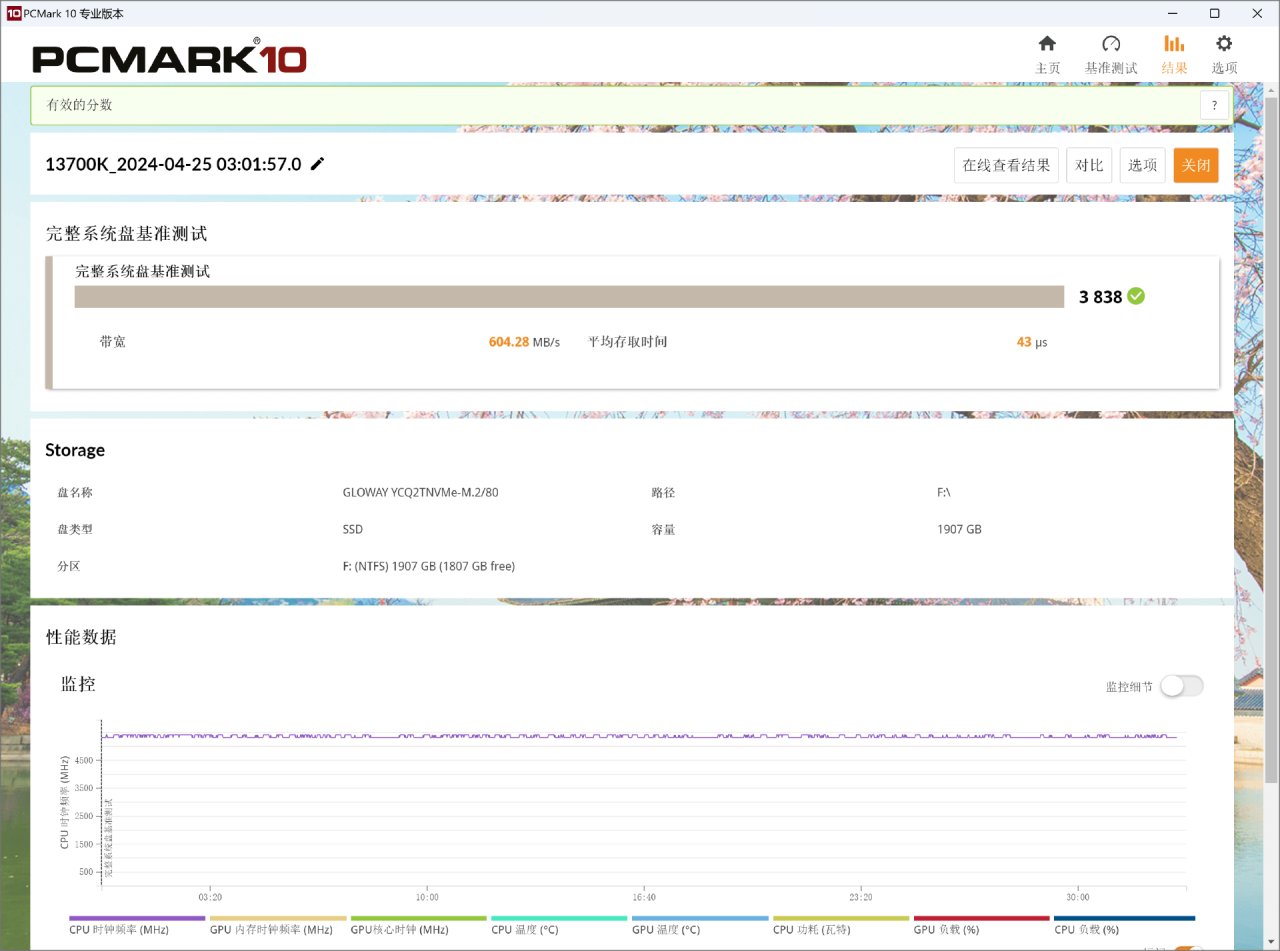 爲了量化這款SSD作爲系統盤時的性能表現,這裏請出了PCMARK 10進行完整系統盤基準測試,可以通過回放操作腳本的方式來量化SSD的性能。空盤狀態下,光威弈二代 2TB的測試表現相當不錯,測試得分爲3838分,平均帶寬爲604.28MB/s,平均存取時間爲43μs,是目前PCIe4.0 SSD的優秀水平: