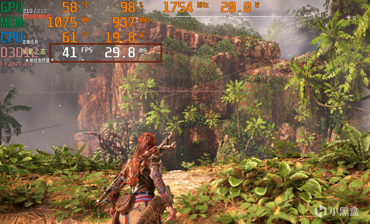 大型动作类《地平线:西之绝境》,画面分辨率设为1280×800,画质选择中等预设档位,关闭FSR效果,实测游戏帧率在41FPS左右,这已经最优画面设置了,假如往上调整画质档位或开高一档分辨率,游戏会降至30FPS以下,毕竟这是大型开放式地图游戏,十分消耗图形性能。