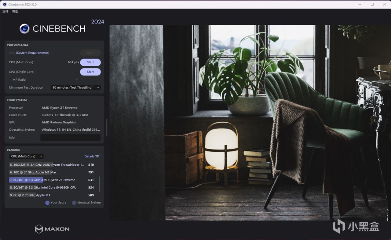 先跑CPU部分的基准性能测试,CineBench系列渲染软件,其中R15软件的多核跑分为1640分,R20软件多核跑分为4383分,而R23软件多核跑分为12816分,单核心的成绩为1613分,以R23多核成绩为例,AMD Z1 Extreme处理器跟自家的锐龙7 7735U性能相若,至于CineBench 2024的多核成绩为631分,在测试过程中经常因内存不足原因报错,2024版的成绩仅供参考。