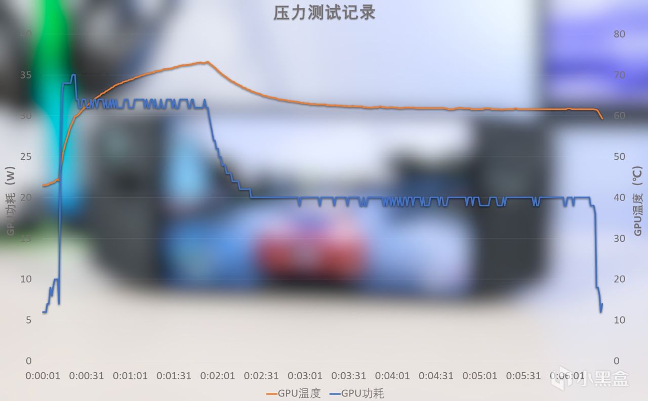 利用FurMark软件对核显进行压力测试,根据记录曲线可见,初段满载功耗能够达到35W左右,然后降至32W并维持一小段时间,最后是满载功耗稳定维持在20W左右,无论单烤还是双烤也是同样的功耗曲线,期间核心温度最高为73℃,然后始终维持在62℃左右,