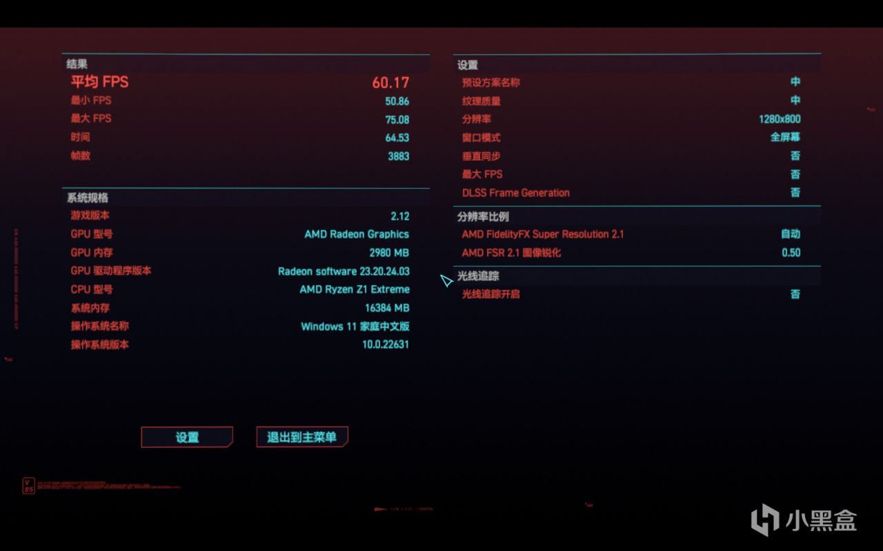先跑大型游戏《赛博朋克2077》,若在2560×1600分辨率下测试,画面会卡成幻灯片,因此将分辨率设为1280×800,并采用预设中等画面设定,默认是开启AMD FSR效果,实测平均帧率能够达到60FPS,假如手动关闭FPS效果平均帧率为48.7FPS。