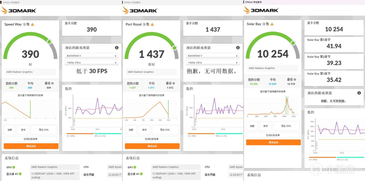 AMD Radeon Graphics核显是支持光线追踪,象征性跑一下吧,在3DMark基准测试软件中的Port Royal项目得分为1437分,Speed Way项目得分为390分,Solar Bay项目的压力较小,移动端芯片都能跑,图形项目得分为10254分,用它来跑光追游戏确实过于难为它了。