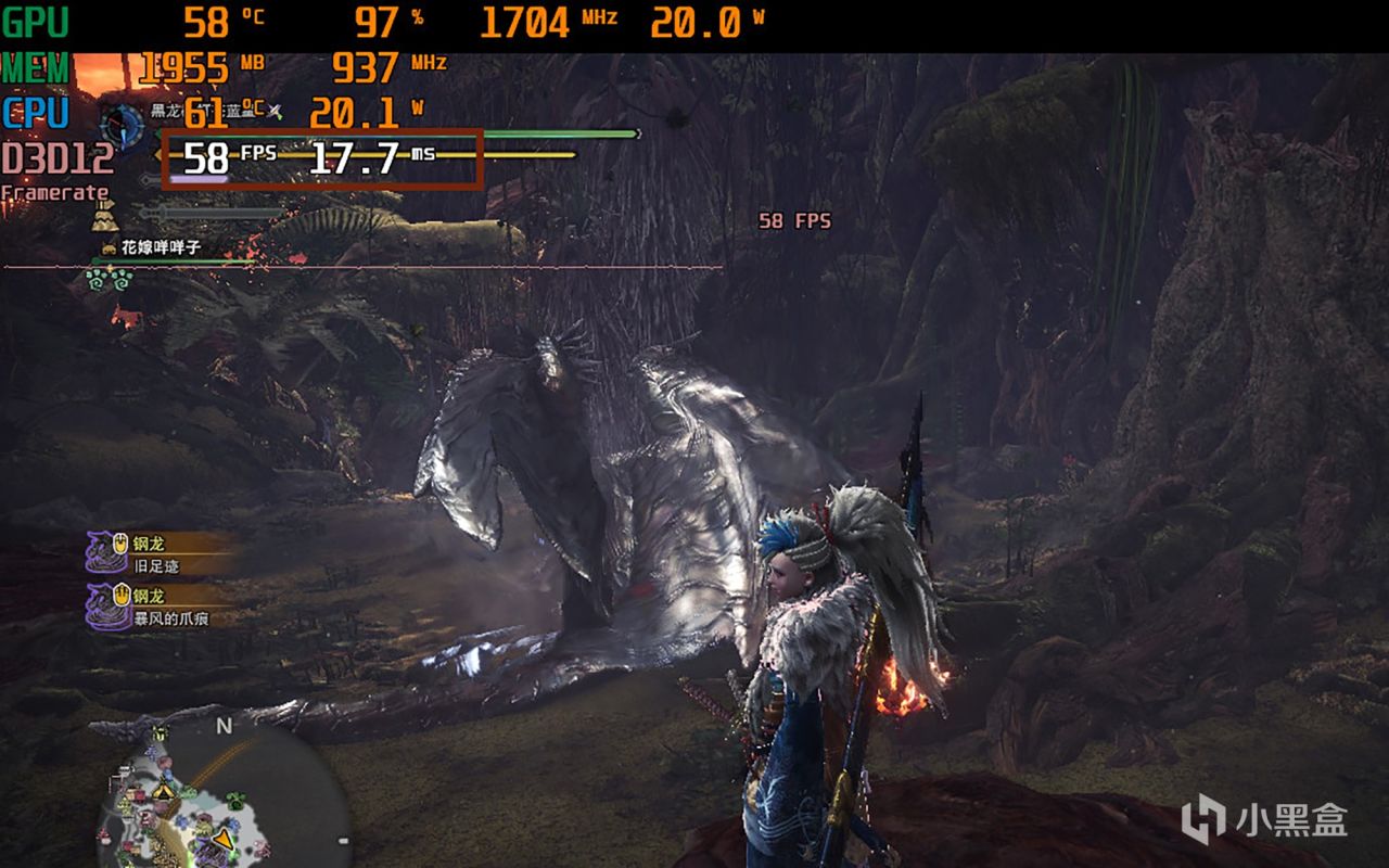 在《怪物猎人世界:冰原》游戏中将画面分辨率设为1280×800,选择预设高画面设定,然后手动关闭反锯齿效果,不然画面会变得模糊,在游戏中进行野外狩猎钢龙,此时平均帧率约为58FPS,假如在1920×1200预设中画面的设定下,帧率会降至46FPS。