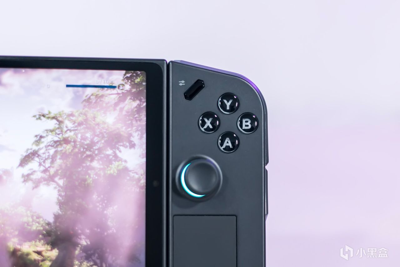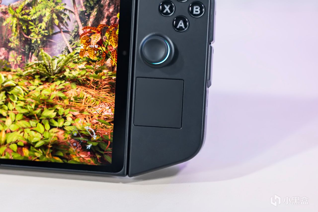 右侧手柄模块的键位就比较多,先来说说正面的,从上往下分别是Legion R按键,用于快速调出侧边控制栏,然后是ABXY四个动作按键,右摇杆,触控板,掌机除了能够利用屏幕操控外,也能通过触控板进行操控,在一些游戏界面需要利用鼠标进行控制,而在双手握持掌机时,突然松开一侧的手进行屏幕操控,容易造成失衡的情况,而触控板有着良好的响应速度和准确性,可利用拇指直接进行操控。