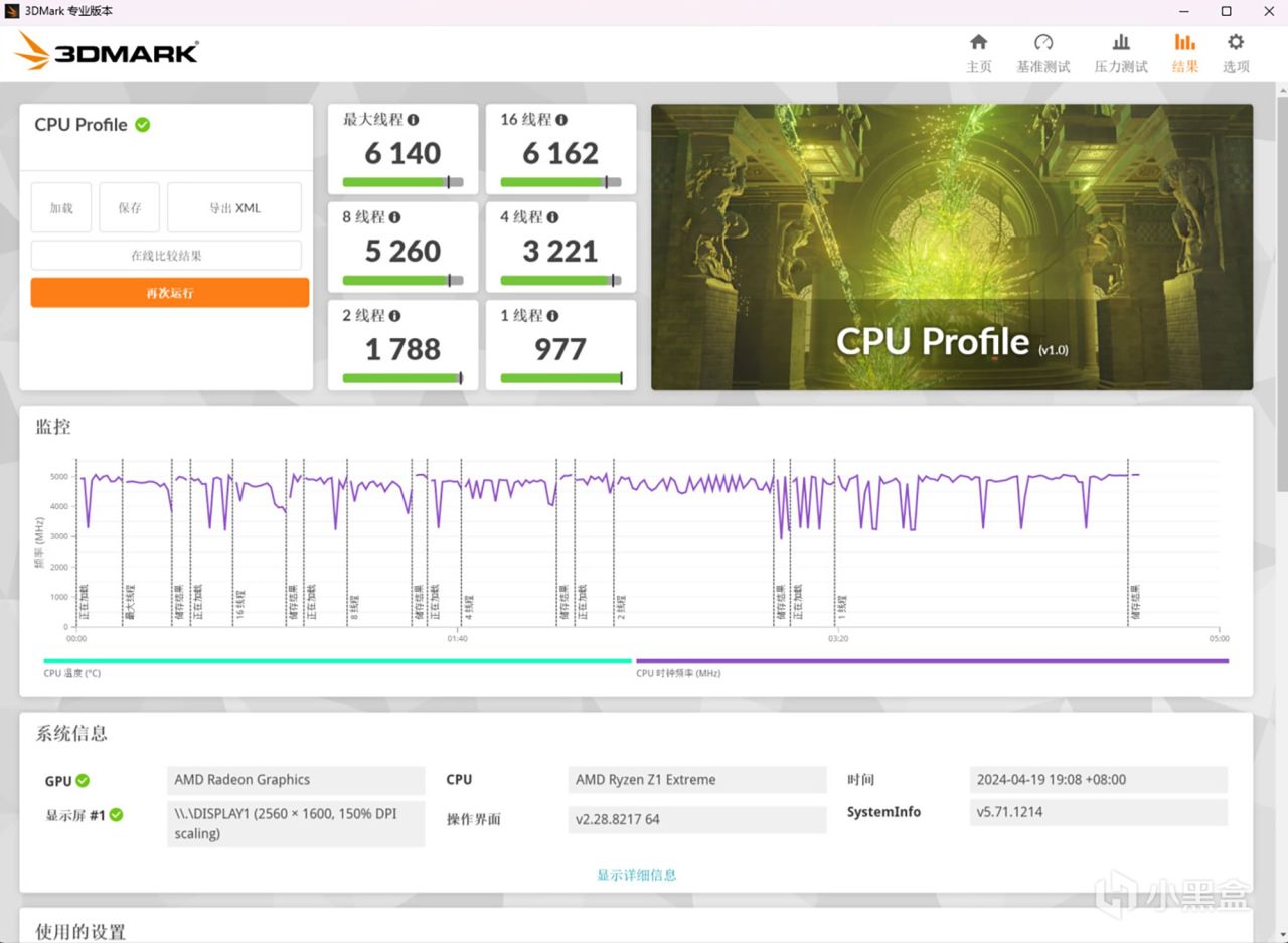 3DMark基准测试软件中的CPU Profile项目,测试处理器在不同线程数下的性能表现,AMD Z1 Extreme处理器的最大线程成绩为6140分,16线程成绩为6162分,8线程成绩为5260分,2线程成绩为1788分,单线程成绩为977分。