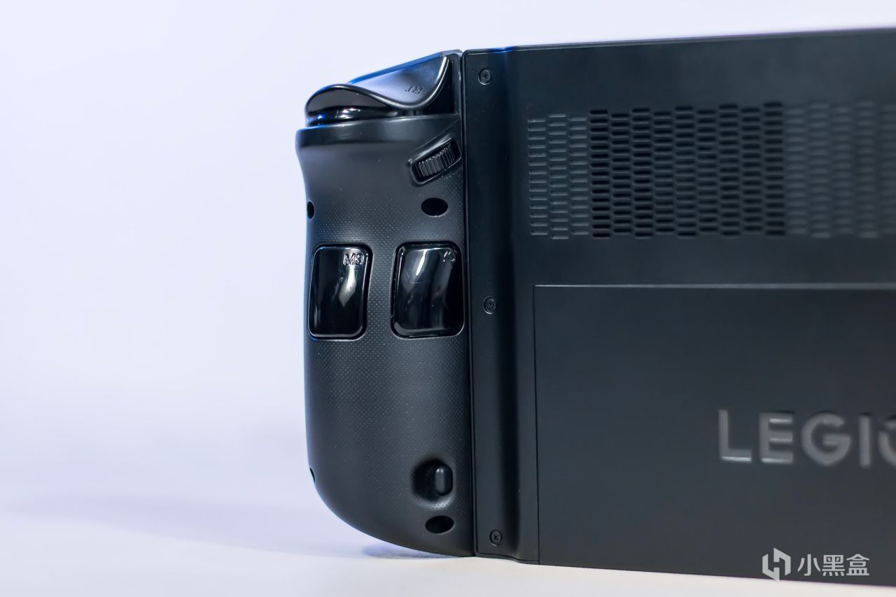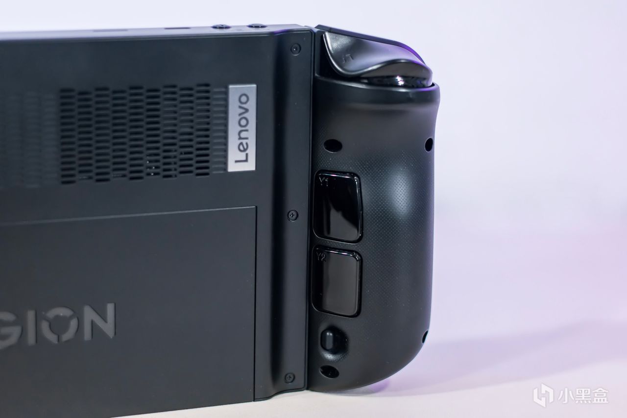 掌机的左右侧均为手柄模块,整体布局类似于XBOX非对称摇杆设计,部分按键布局还是进行优化,先说一下左侧的手柄,正面从上往下分别是Legion L按键,用于快速启动掌机控制台的,然后是左摇杆,十字方向键,菜单键,视图键,顶部依然是LT与LB两个按键,背面是Y1与Y2两个按键,可用于设置按键映射或宏命令释放按键,下方是手柄释放按钮。