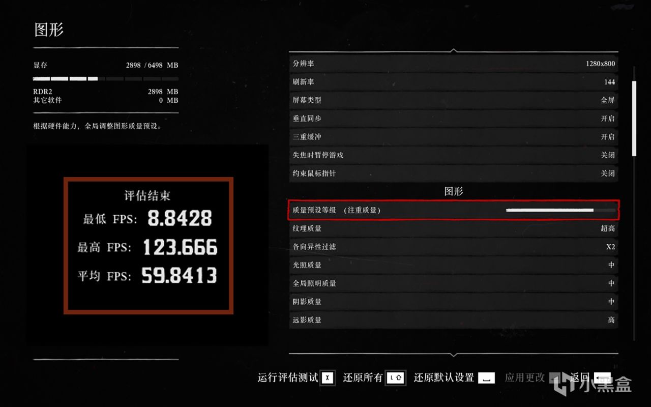 在《荒野大镖客2》游戏中将画面分辨率设为1280×800,游戏画面质量预设等级提供了20个不同档位,本次选择第十七个档位(注重质量),以及DirectX 12 API模式,其它画质选项不变,内置基准测试的平均帧率为59.8FPS。