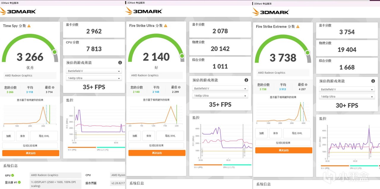 先跑3DMark软件中光栅性能基准测试项目,AMD Radeon Graphics核显在DirectX 12 API下的Time Spy项目图形得分为2962分,而在DirectX 11 API下的Fire Strike Ultra项目图形得分为2078分,Fire Strike Extreme项目图形得分为3754分。