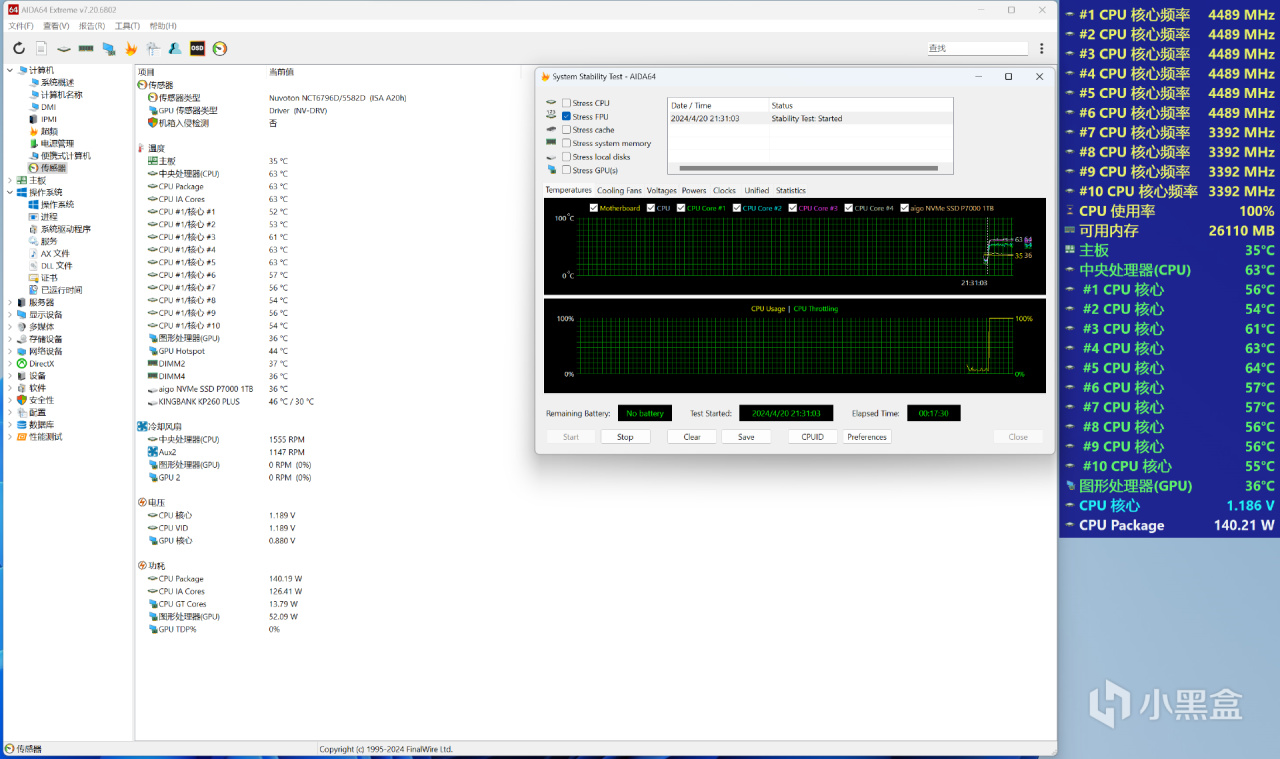 通過AIDA64單烤FPU實測,i5-12600KF整體功耗爲140W出頭,冰魄SX360水冷散熱器都不用滿載運行,核心溫度最好僅爲63℃。