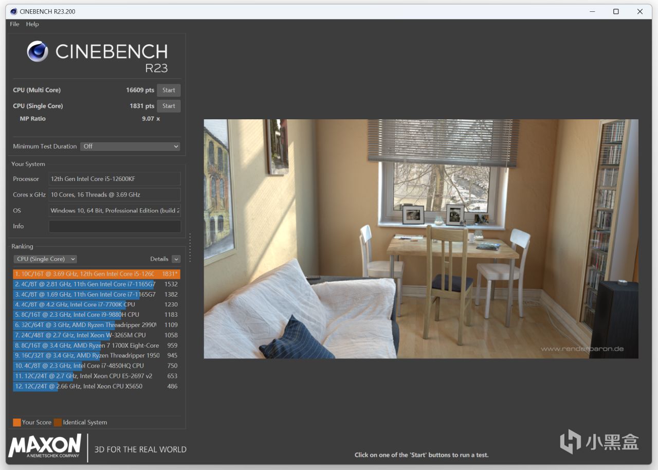 CINEBENCH R23實測,CPU多核成績爲16609,單核成績爲1831。