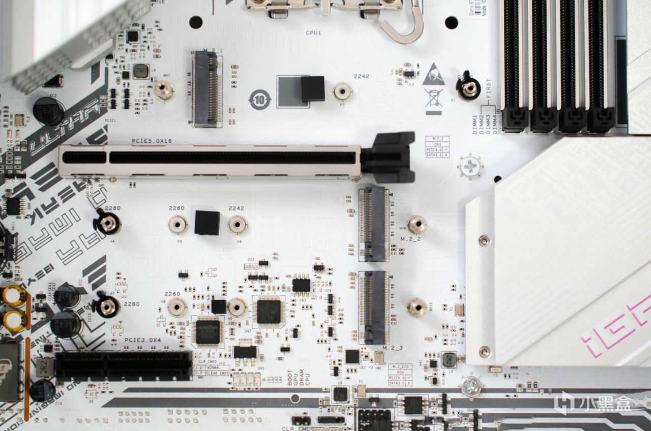 M.2接口方面,該主板一個搭載了3個,都是PCIe4.0*4傳輸協議,其中第一個插槽爲CPU直連,兼容2242與2280兩種M.2固態規格;PCIe插槽下方2個爲芯片組提供帶寬,兼容2242、2260與2280三種M.2固態規格。