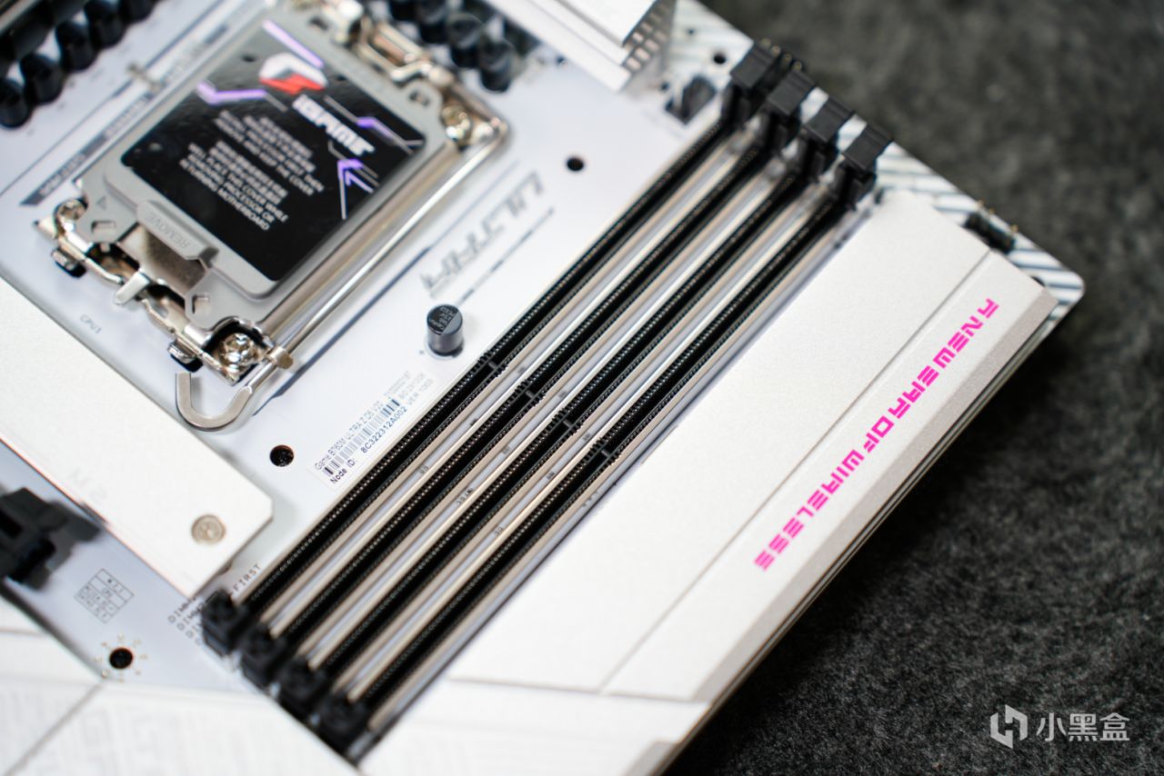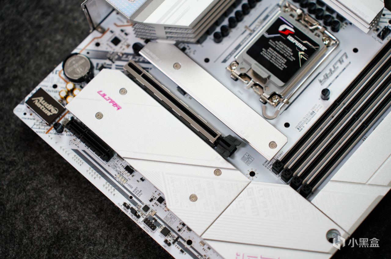 七彩虹iGame B760M D5背插主板爲標準的M-ATX版型設計,採用了銀白色的散熱裝甲與白色的PCB,再加上粉色的字體進行點綴,配色非常醒目。當然,最吸引人的就是接口,常規主板上的主板供電、CPU供電、USB等接口都通通不見了,尤其是在內存的右側,該主板使用的是一塊金屬蓋板。