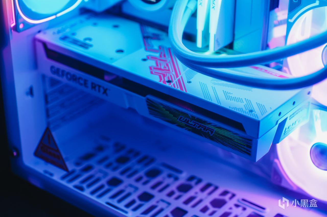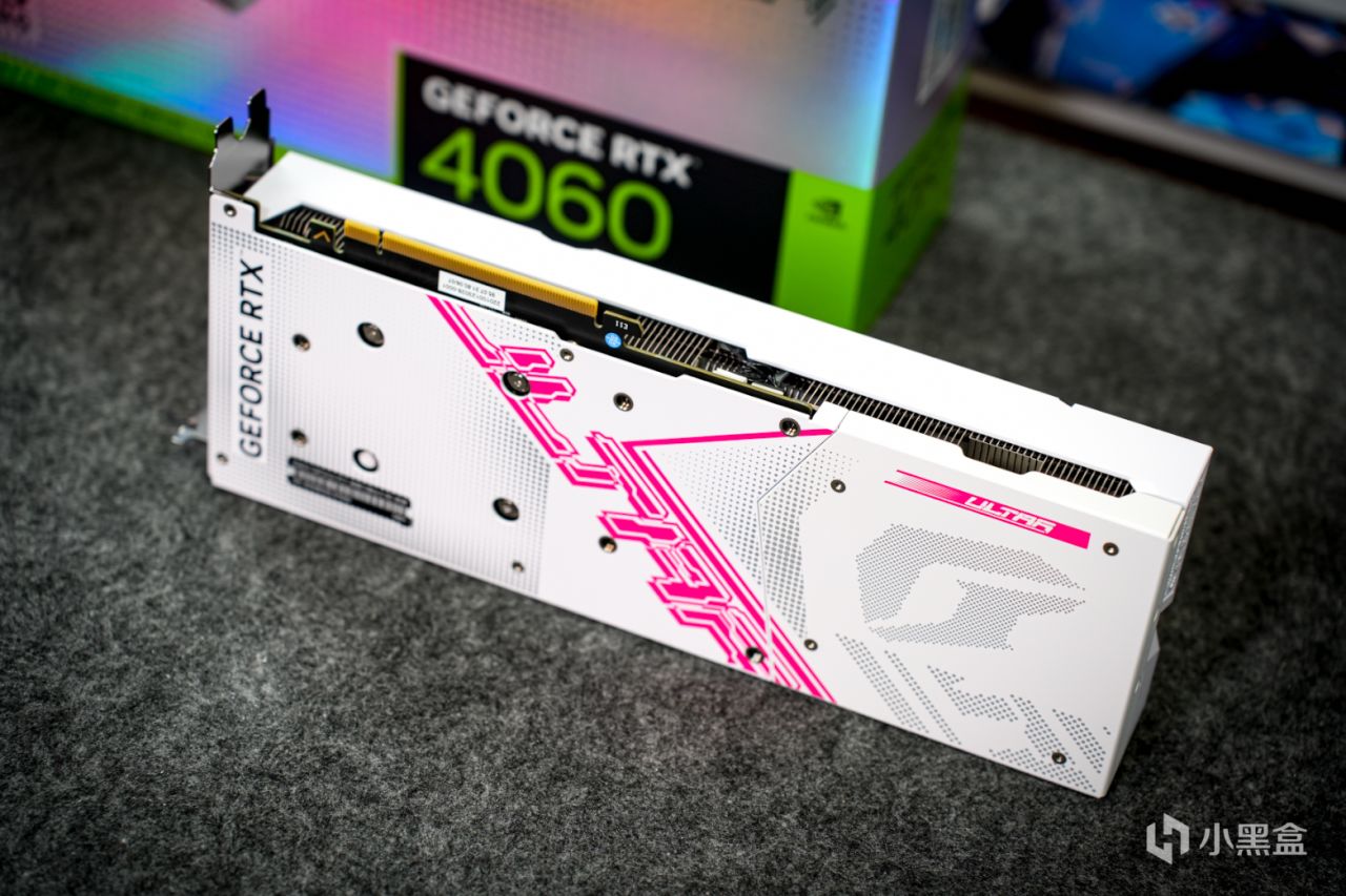 該顯卡與主板一樣,也都是隸屬Ultra家族,所以設計風格也都保持一致,比如顯卡的導風罩上也是採用了彩色波普風格鐳射標語,在不同光線下能呈現出不同的色彩,視覺效果非常吸睛。同時可以看到,顯卡的頂部常見的位置並沒有搭載供電接口。