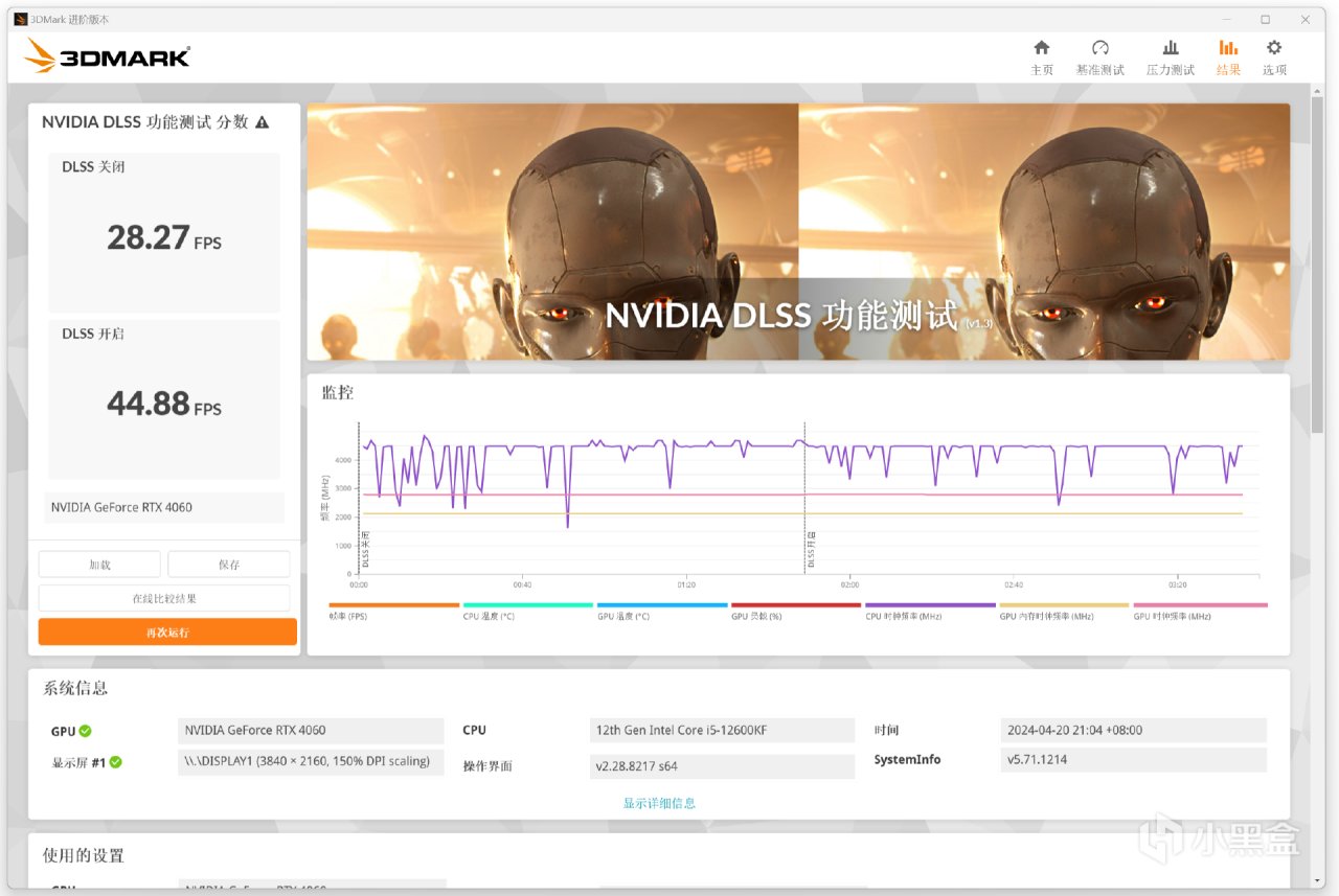 DLSS 3.0測試關閉爲28.27FPS,開啓爲44.88FPS。